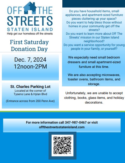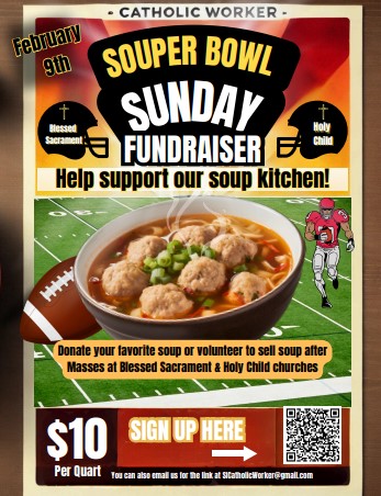 The SI Catholic Worker will be selling soup on Sunday, February 9th to benefit their weekly soup kitchen and monthly meals. Please email us or scan the QR code on our flyer to volunteer to make HOMEMADE soup/chili. We look forward to you sharing your favorites with us! Please email us at SICatholicWorker@gmail.com for the link to register. Quarts of soup that are labeled can be dropped off that morning at a north shore or south shore location or picked up earlier in the week. QUART CONTAINERS WILL BE AVAILABLE FOR PICK UP OR DELIVERY.