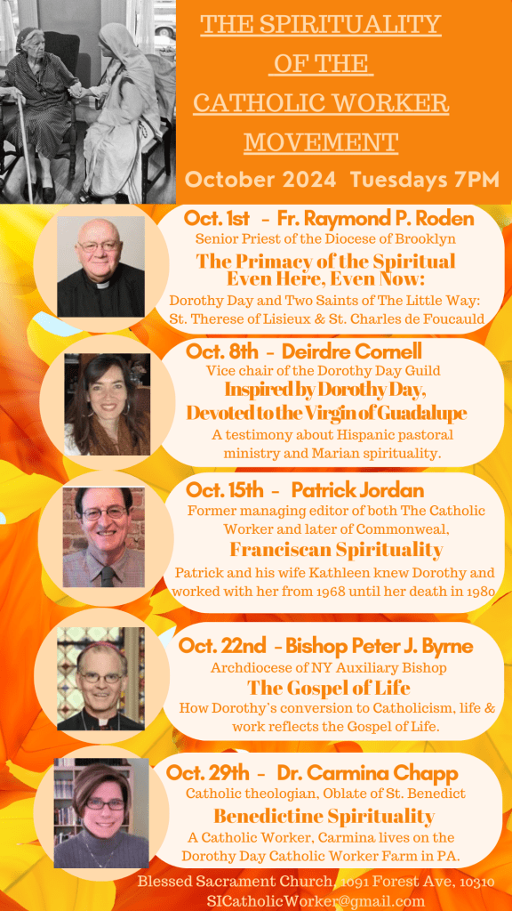 Join us to learn about the Spirituality of the Catholic Worker Movement with talks by speakers on the various charisms lived by Dorothy Day and those who serve the poor, practicing hospitality through the corporal and spiritual works of mercy.