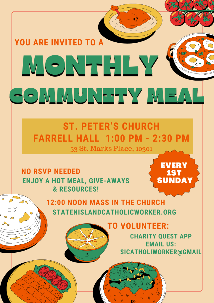The Staten Island Catholic Worker is hosting a Monthly Community Meal for those in need in our community beginning on Sunday, March 3rd at Farrell Hall located at St. Peter’s Church on St. Mark’s Place in St. George. We will be providing a hot meal, giveaways, and resources for those who attend from our parish food pantries. Donations are being accepted via electronic payment or checks can be mailed to Dorothy Day House of Hospitality, P.O. Box 61264, SI, NY 10306. If you are interested in volunteering for this meal, donating a hot tray of food, or would like to be on our email list for updates, please email Debbie at SICatholicWorker@gmail.com. More information, the food sign-up and donation links can be found on our website: StatenIslandCatholicWorker.org. We appreciate your support!