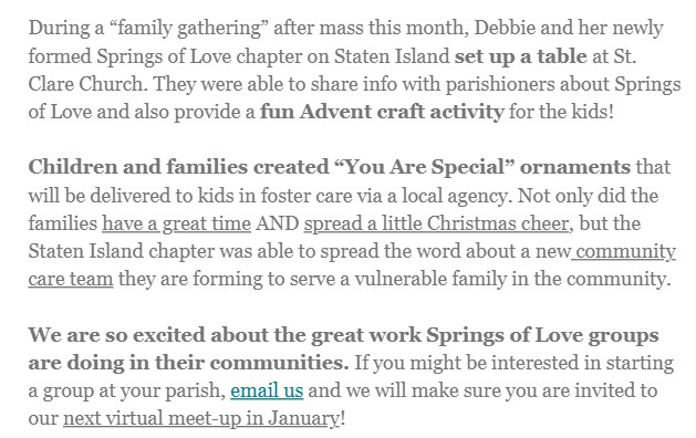 - Subscribe to Springs of Love Monthly Newsletter HERE See below where we were highlighted in the December Springs of love newsletter!